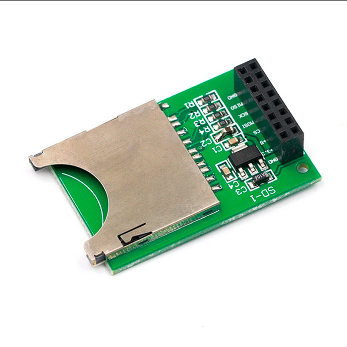 This SD card module adopts a pop-up SD card socket, the pins are led out with a pin header, and a double pin header.